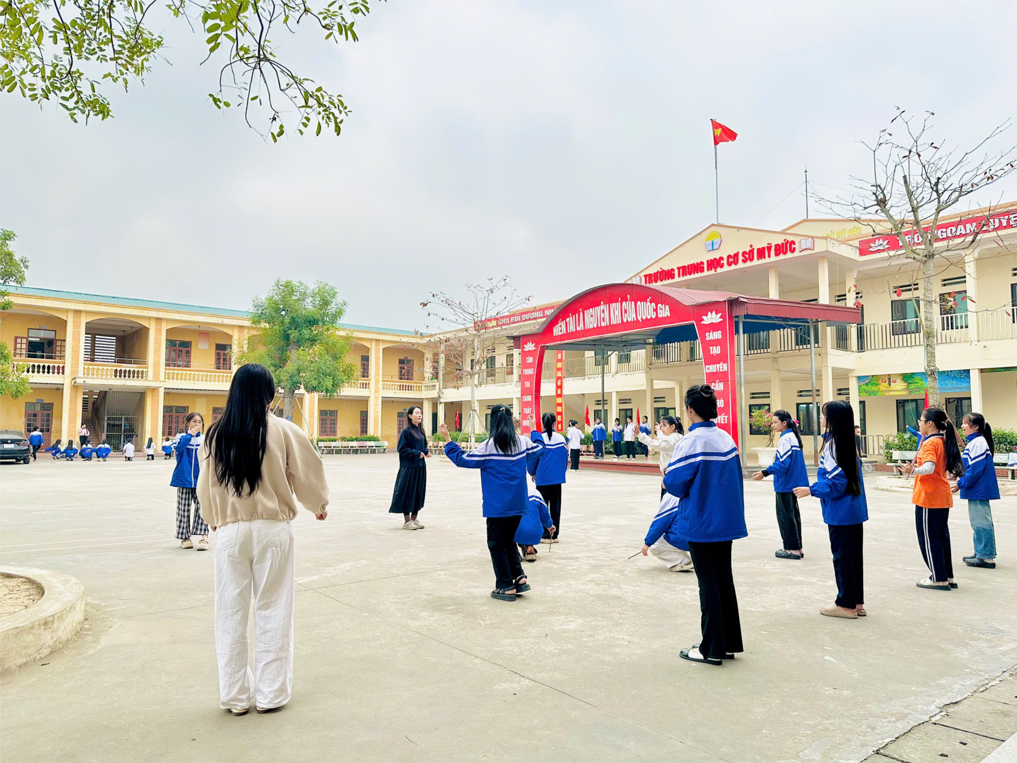 Trong không khí rộn ràng tại sân trường THCS Mỹ Đức, cô và trò lớp 6D5 đang tích cực luyện tập văn nghệ để chuẩn bị cho chuyên đề cấp thành phố. Dưới sự hướng dẫn tận tình của giáo viên, các em chăm chú tập từng động tác, phối hợp nhịp nhàng theo đội hình, thể hiện tinh thần nghiêm túc nhưng không kém phần hào hứng. Buổi luyện tập diễn ra trong không gian thoáng đãng, tràn đầy năng lượng tuổi học trò. Hoạt động không chỉ giúp học sinh lớp 6D5 rèn luyện sự tự tin, kỹ năng biểu diễn mà còn tăng cường tinh thần đoàn kết, góp phần tạo nên những tiết mục văn nghệ chất lượng, sẵn sàng cho sự kiện quan trọng sắp tới của nhà trường.