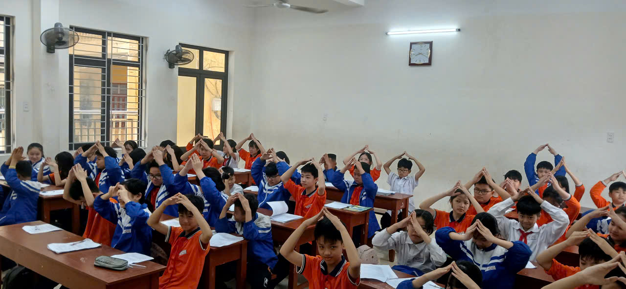 Cụ thể, giáo viên đưa ra các câu hỏi trắc nghiệm liên quan đến nội dung đã học. Thay vì trả lời theo cách truyền thống, học sinh sử dụng tay và cử chỉ để tạo hình tương ứng với các đáp án A, B, C, D đã được quy ước trước. Ngay khi câu hỏi được nêu ra, cả lớp nhanh chóng suy nghĩ và đồng loạt thể hiện lựa chọn của mình bằng hình thể.